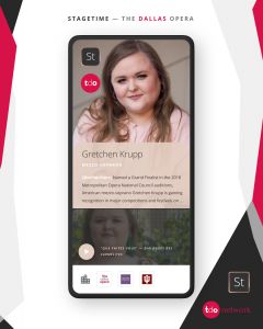 Meet mezzo-soprano Gretchen Krupp, who will be joining the Dallas Opera as Tebaldo for our spring production of Don Carlo. During the pandemic, Gretchen’s been keeping herself busy. “Like most people, I have been baking up a storm. I even had a sourdough starter going for a few months. In between bakes, I have been studying roles, reading more, and taking nature walks. I have also been grateful for the quality time with my family — something I do not get enough of when I am on the road.” Gretchen also used her downtime to acquaint herself with StageTime. “My favorite part about StageTime is the connectivity. It is so nice to have a platform created specifically for professional networking. I am a huge fan of…how modern, sleek, and accessible the design is.” To learn more about Gretchen and her achievements and performances, check her out on StageTime by clicking here!